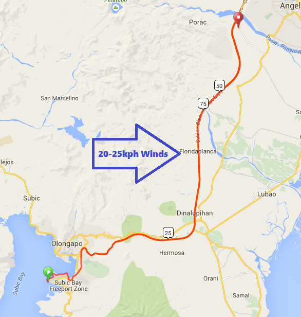 (2) The second portion of the bike course consists of a long 21km stretch of road from Dinalupihan to Floridablanca. This is relatively flat but quite windy. According to the wind data I aquired recently, there have been gusts of wind coming from the west with speeds up to 25kph. This means that relatively strong winds will hit us from the side. If this trend continues, it’s better to avoid deep section wheels especially for those who aren’t that confident with their handling skills. Aside from the wind, the roads are actually quite nasty. The vibrations from the rough concrete/asphalt can sap your strength. Thus, pacing and nutrition is absolutely crucial for this stretch. The hardest part of the course is yet to come.