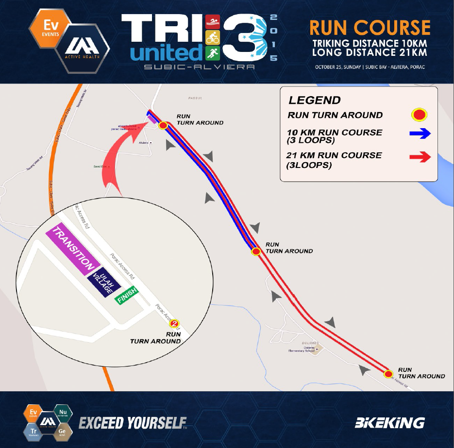 Think of the run course as a hill repeat workout. Each loop is 7km long and each athlete would need to do 3 loops.The grade is close to 2% making it quite challenging. The lack of shade and the ambient heat from the cement, soil, and lahar make it worse. Out of transition, most people would probably go out blazing through the downhill segment; however, it would be best to respect the hill and pace yourself properly. Fatigue is like a leech that gradually saps you of your energy. By the last loop, things will feel 3x more difficult than when you started. Once you cross the finishline, it will be pure bliss!
