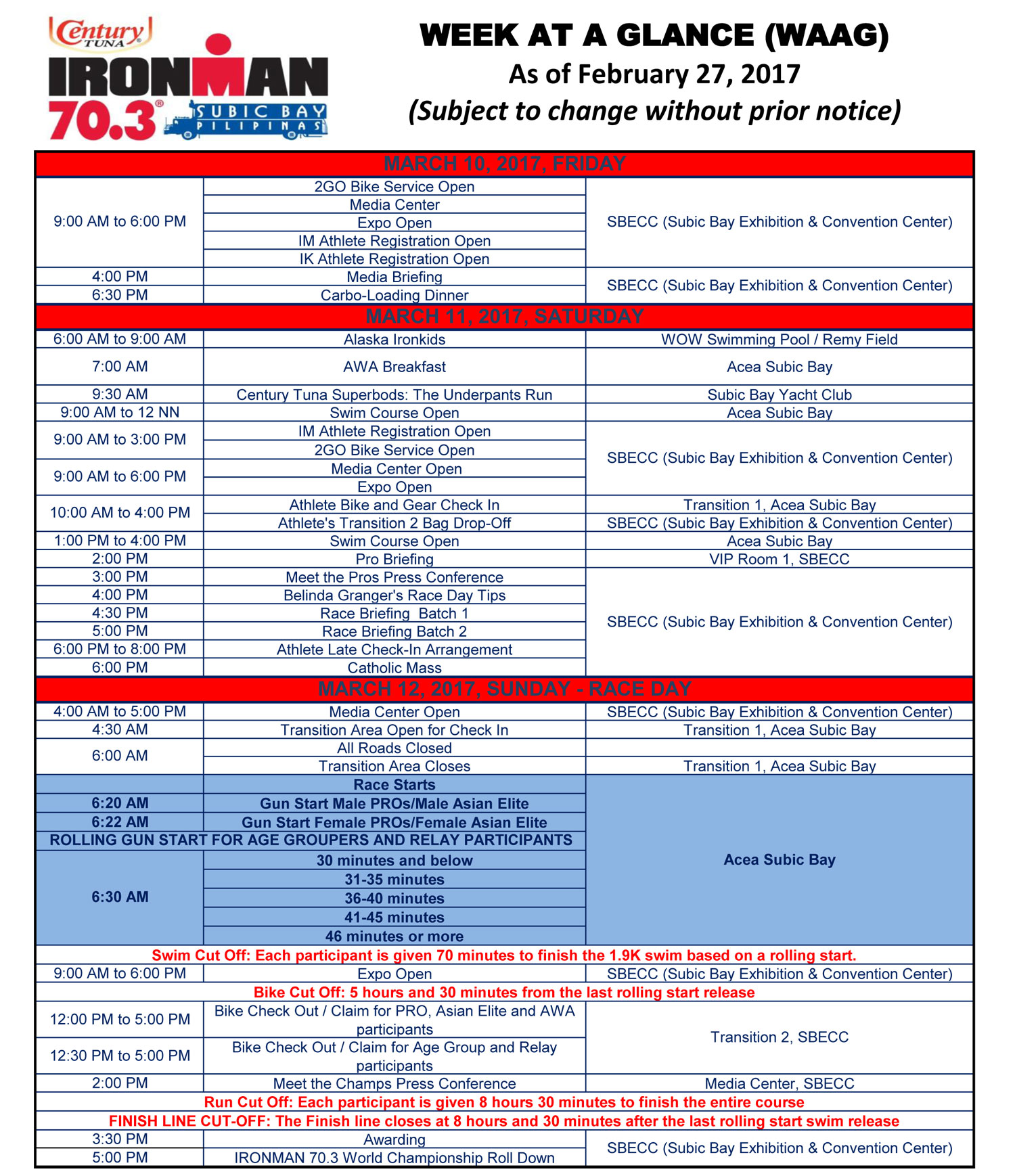 Athlete registration is from 9am to 3pm at the Subic Bay Exhibition and Convention Center (SBECC). Make sure you bring a valid ID.Bike check in will only be allowed on Saturday (10am-4pm). Late bike check in and registration will incur a penalty fee.Timing chips need to be claimed in T1 as you check in your bike.You will need to drop off your T2 bag. Since T1 and T2 are separate, you need to put your run gear in a designated bag and drop these off in SBECC on Saturday (10am-4pm).You also have bags for your other gear Swim, T2, change of clothes, and a number for your bike pump. Please use them as this ensures your gear doesn’t get lost or misplaced.You cannot leave your gear together with your bike as you check it in. Bring your stuff on race morning. Take note that there will be a helmet check as well.Make sure you entrust your car keys to a supporter. Don’t bring it along with you during the race or leave it in your T1 bags. Better safe than sorry!Attend race briefing to make sure you don’t miss out on important reminders or pointers (4:30 and 5pm batches).Transition closes at 6am sharp on Sunday! So make sure you arrive early.Make sure you put all your stuff in your basket. Especially if you don’t want to lose them.