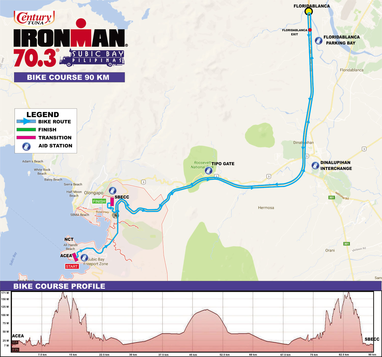 The final climb back is often the most challenging. The fatigue, heat, and heavy legs will make the hill harder than it should be. This is where mental training and focus comes into play. A tip from elite athlete (and Century Tuna Poster boy) Nikko Huelgas comes in handy during such situations. He advises to relax and keep calm during very tough efforts. Focusing on how difficult it is will only make it tougher; instead, try to block out the pain. Use a lighter gear and spin up the hills. Remember to keep yourself relatively fresh for the run.