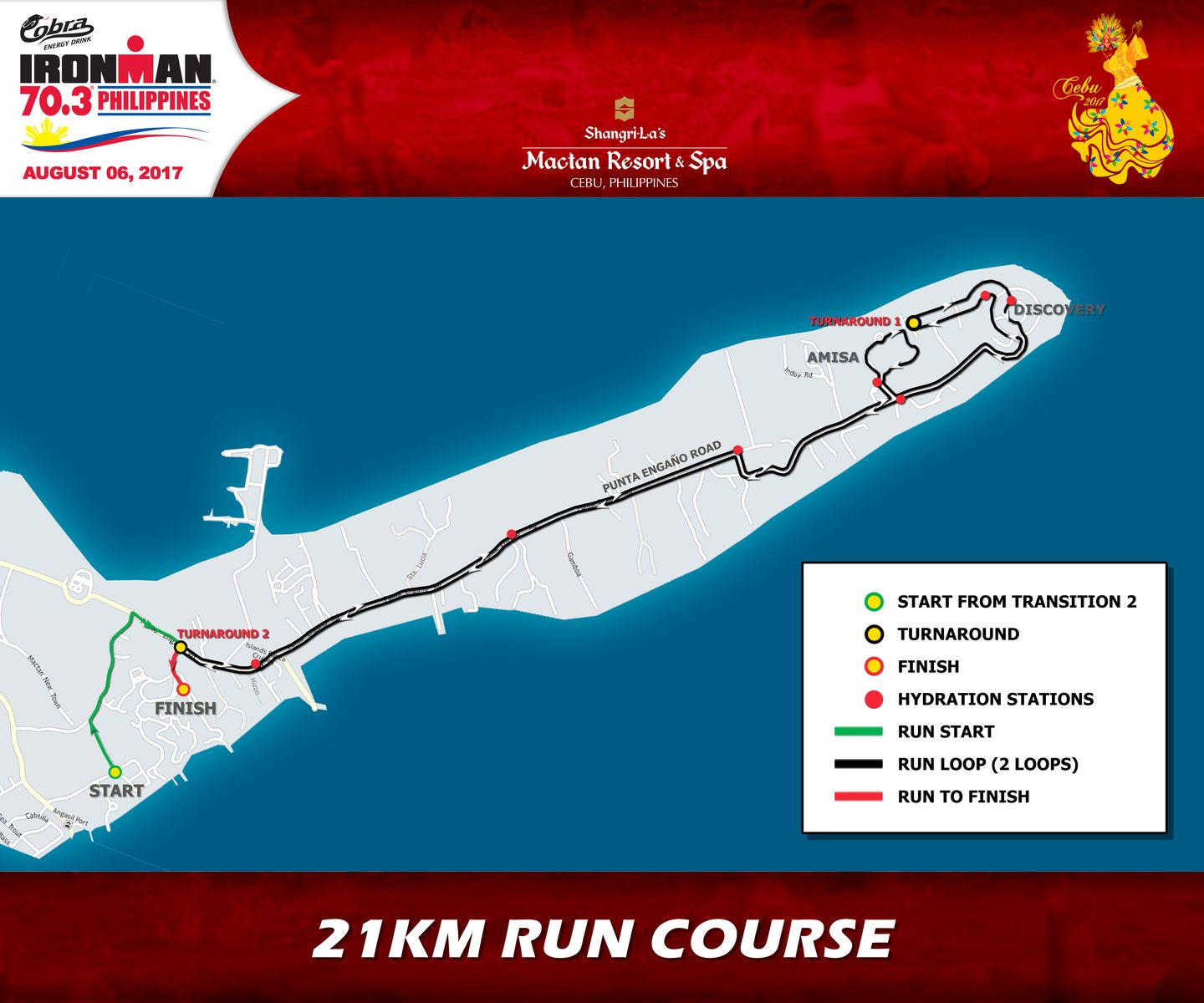 This is the make or break part of the race. After racing for several hours now you’d still need to travel 21km on foot! The run course along Punta Engano is notorious for being hot and humid. Out of T2, you will need to run in a narrow side street adjacent to Shangri-La. This segment is very hot and difficult. The wobbly legs from the bike make it an even greater challenge. Don’t push the pace too quickly; start off easy and find your legs after a kilometer or so. I recommend wearing a hat or visor as most of the run course isn’t shaded (except for the parts in front of the hotels). Aid stations will be 1.5km apart, take your time as you approach each one. Be courteous, take a cup or two then move away. This will allow other athletes to grab their share.