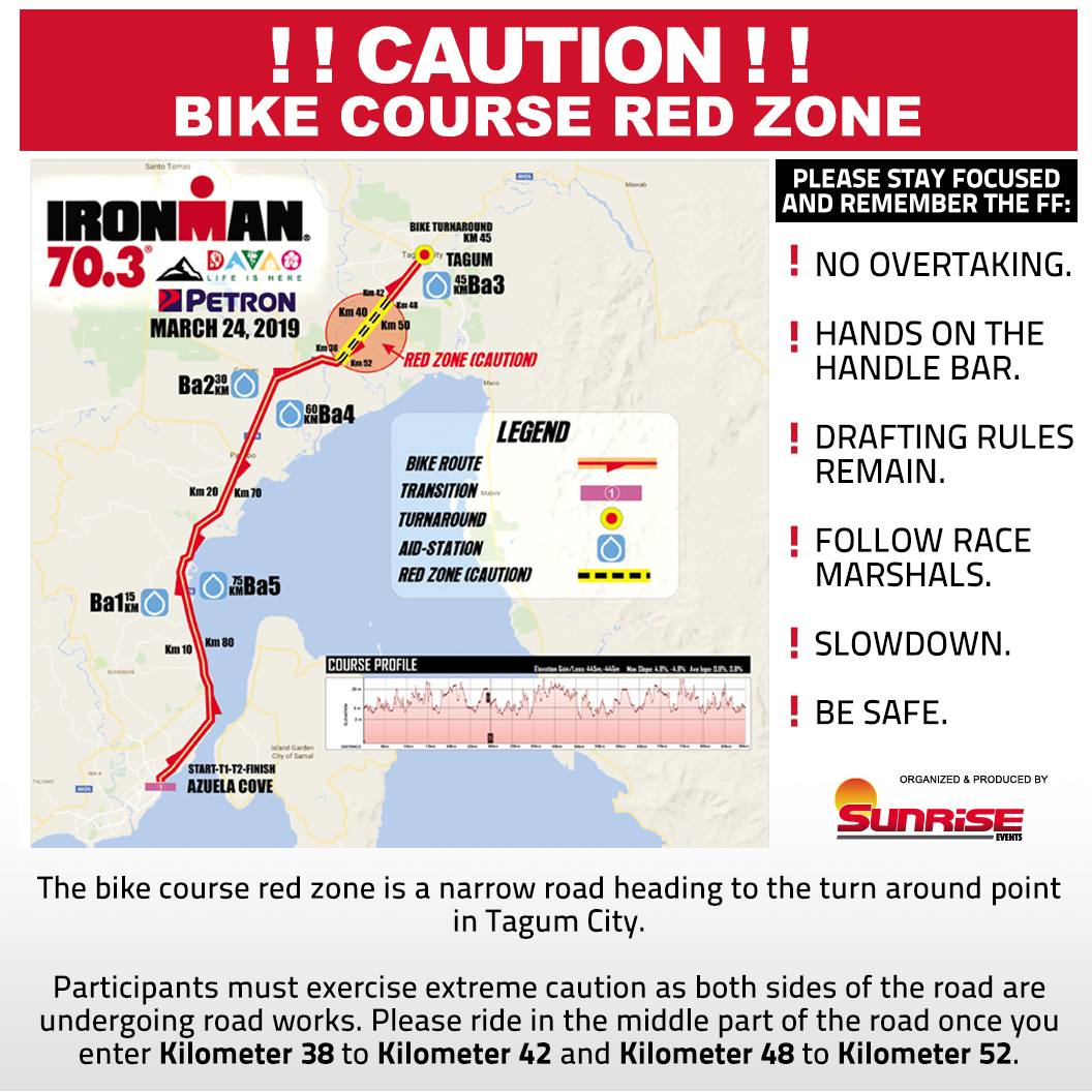 Also, don’t forget about the RED ZONE on the bike course. Lots of accidents happen here so make sure you take caution. No overtaking, ride safely, stay alert.