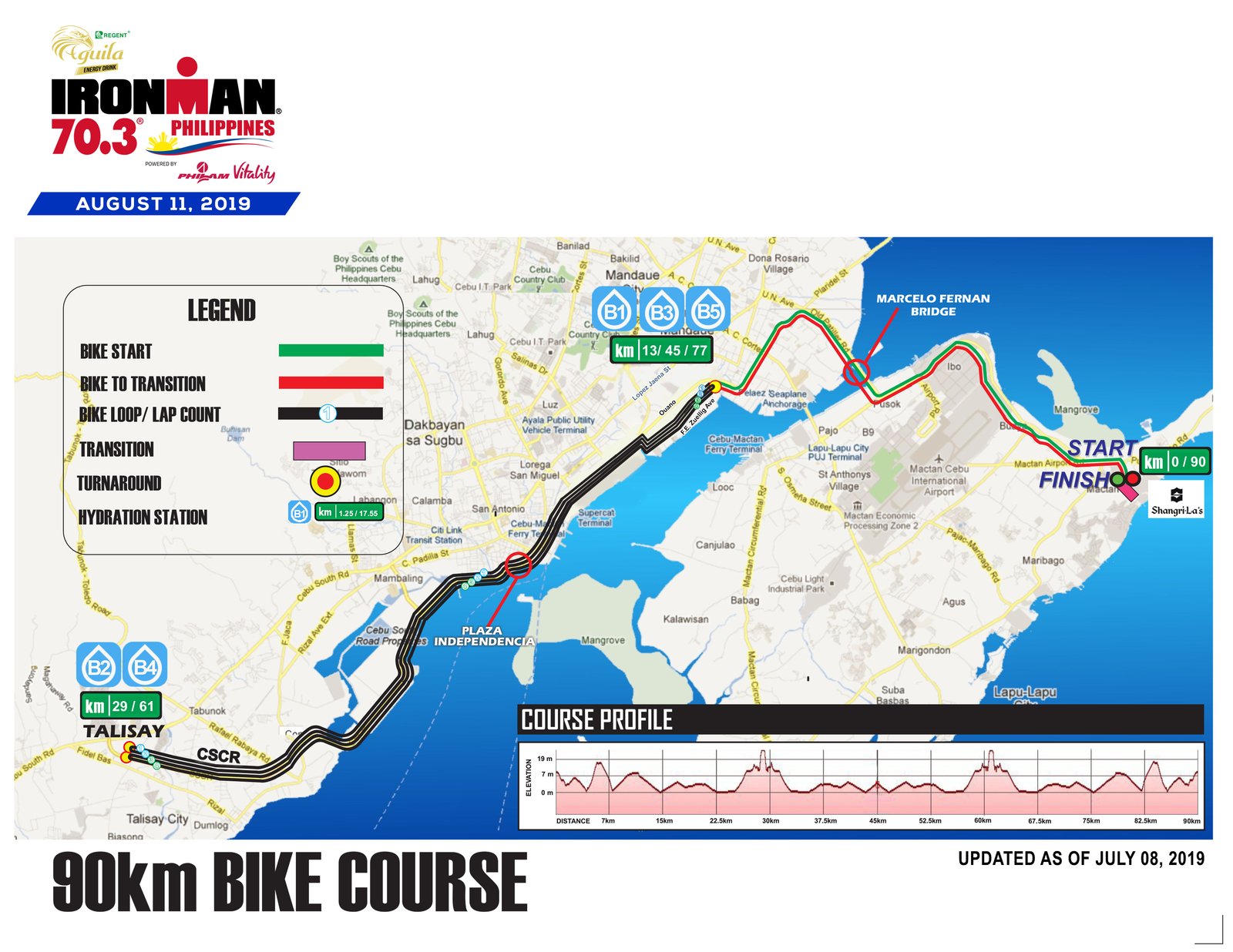 The swim is straightforward. It’s a looping point-to-point swim along the beaches of Shangri-la Mactan right? Nope! This has got to be one of the most challenging swim courses of the Philippine race calendar. Since the swim course is situated in a channel, expect some strong currents due to water funneling through it. We’ve had some really bad years where dozens of participants were cut-off this early. Luckily, this year seems a bit more optimistic, Spring tide happened last week. What does this mean? It means tides will probably have a lesser impact on the currents. We believe this will translate to faster swim times. However, we cannot discount the fact that there will always be a strong current because of the aforementioned channel. I suppose it’s just a question of how strong the current will be and what direction it will be pushing towards. Both of which are rather unpredictable so just be prepared!